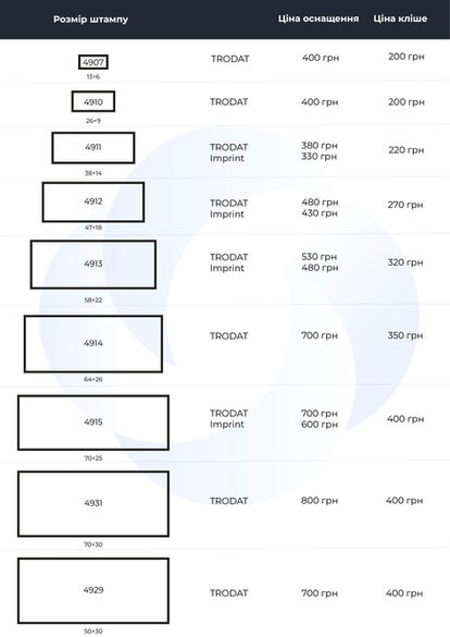 Щоб дізнатися вартість готової печатки, додайте ціну кліше потрібного розміру та оснащення.